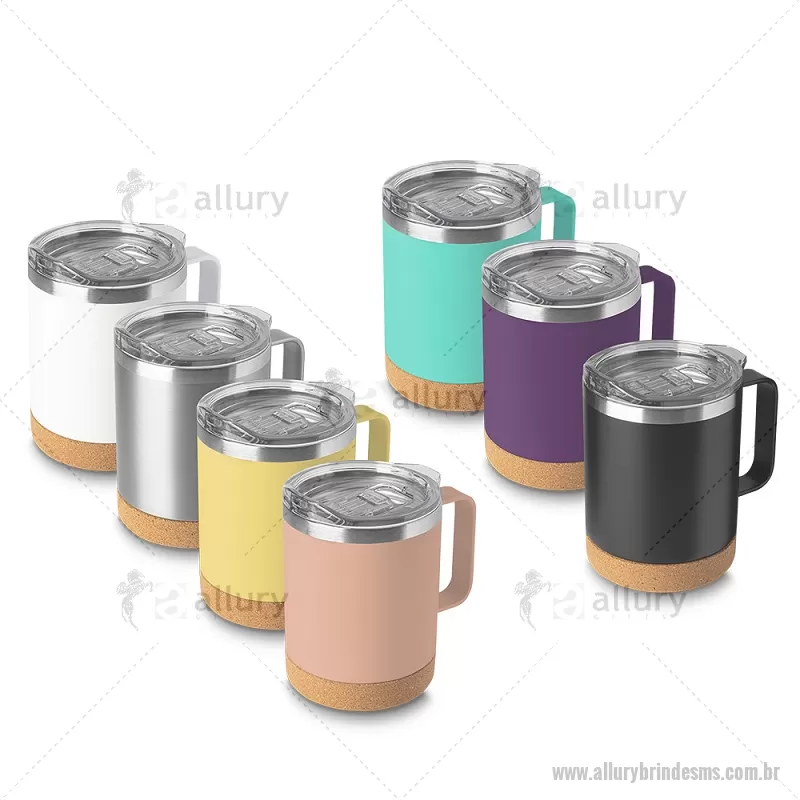 Caneca térmica em aço inox com parede dupla isolada à vácuo, tampa plástica e anel em silicone para vedação, alça lateral em inox na cor do produto, base em cortiça. Capacidade 350ml. - - ALLMSCAN076